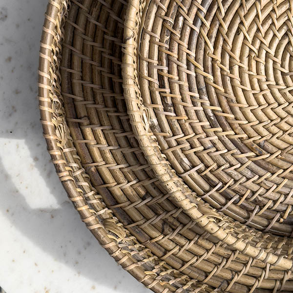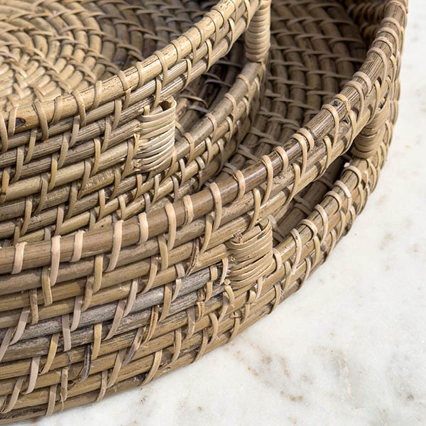 2-pack brickor i rotting, utrustade med praktiska handtag för enkel hantering. Perfekta för att servera frukost på sängen, kaffe till gäster eller som en dekorativ bas för ljus och andra inredningsdetaljer. De handflätade brickorna kombinerar naturlig skönhet med funktionalitet, vilket gör dem till ett mångsidigt och stilfullt tillskott i ditt hem.
