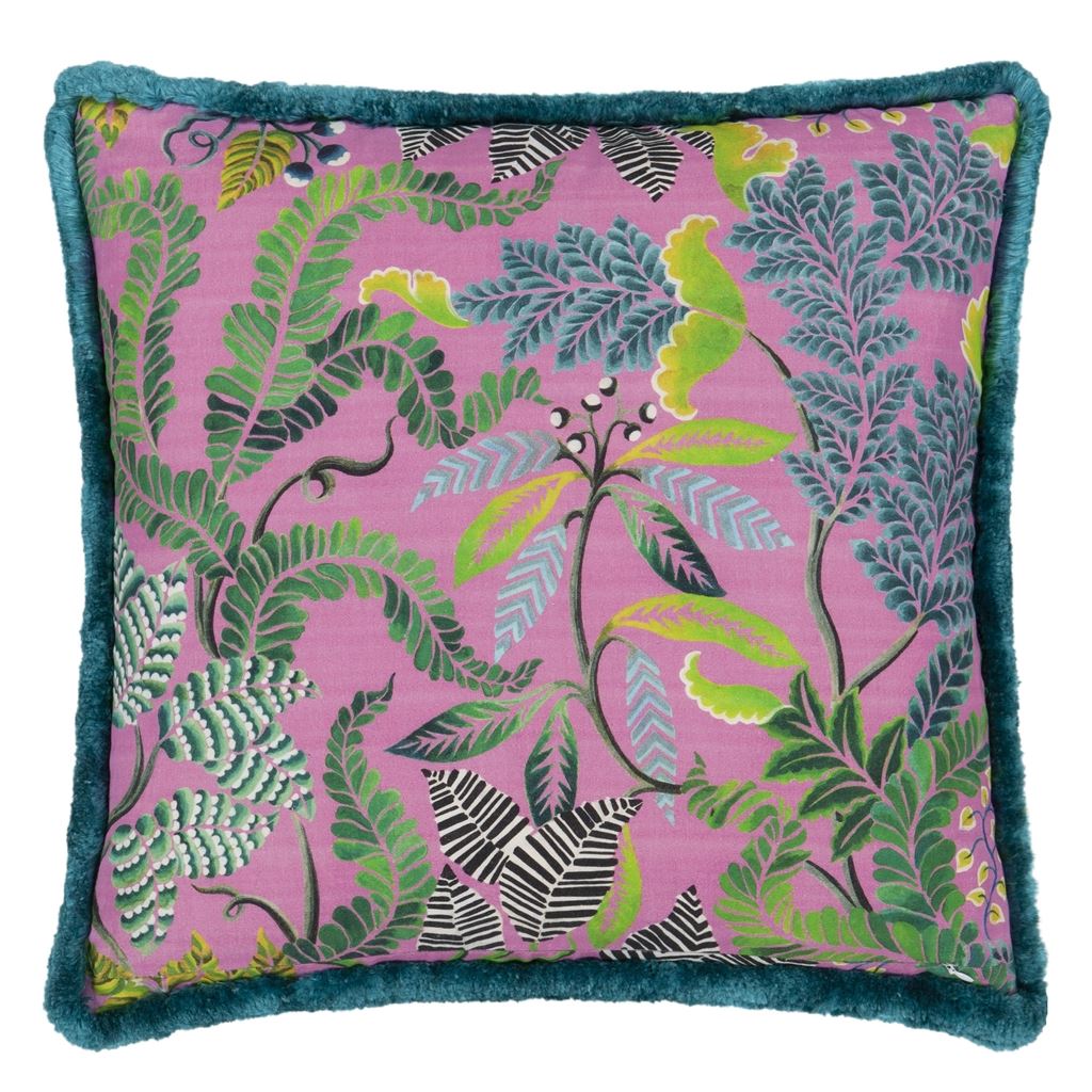 This large square floral cushion will bring a colourful touch to your interior space. Lavishly embroidered onto a bright cerise pink ground, inspired by the rich decorative brocades used in the interiors popular at the time of the 1905 Salone d’Automne in Paris. Finely painted flowers and foliage, arranged in a cleverly mirrored form with shaded petals and striped leaves adding to it’s decorative nature. In soft sophisticated tones, this stylish embroidered cushion is paired with a leaf pattern digitally printed on the reverse and finished with a luxurious brush trim in turquoise on all sides.