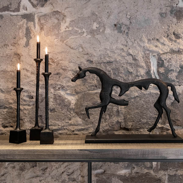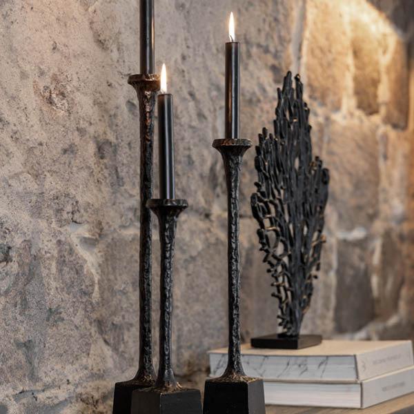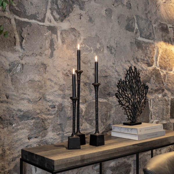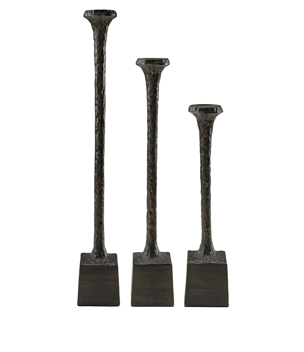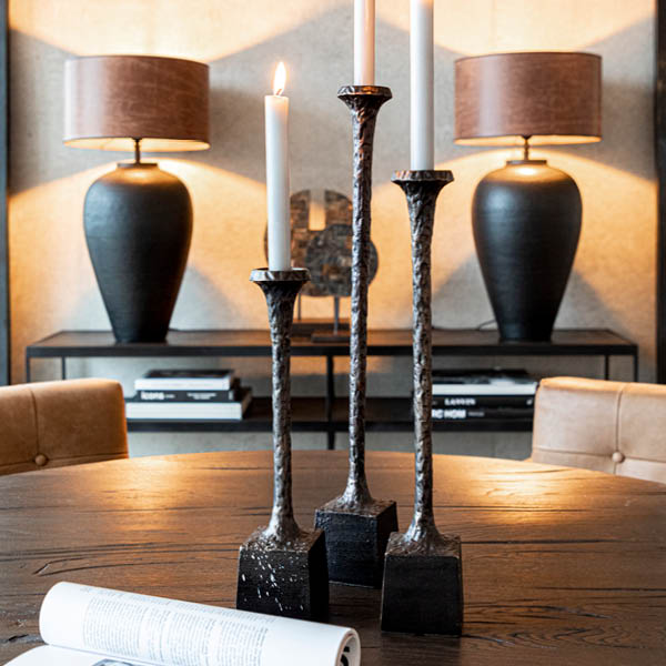 Ett set med 3 eleganta ljusstakar i metall med hamrad yta. Perfekta för att skapa en stilfull och varm atmosfär i vilket rum som helst. Hållbara och mångsidiga, passar både modern och klassisk inredning.