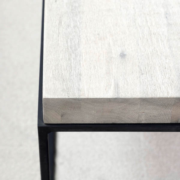 Sidobord Carlisle kombinerar rustik charm med modern elegans. Med en 6 cm tjock bordsskiva i massiv ek och ett stilrent underrede i metall, erbjuder detta bord både stabilitet och ett sofistikerat uttryck. Perfekt som avlastningsbord i vardagsrummet, nattduksbord i sovrummet eller sidobord i hallen.