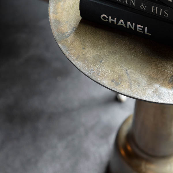 Runt sidobord i metall med sofistikerad svarvad fot. En perfekt kombination av modern elegans och klassiskt hantverk – detta stilfulla sidobord tillför både karaktär och funktionalitet till ditt hem. Varje bord är unikt, med subtila variationer i finish och detaljer som förstärker dess charm och exklusivitet. Tillverkat av högkvalitativ metall har bordet en slät och hållbar yta med en raffinerad finish, vilket gör det idealiskt för moderna, industriella eller vintageinspirerade interiörer. Den elegant formade foten ger en konstnärlig och sofistikerad touch, vilket gör detta sidobord till mer än bara en praktisk möbel – det blir en designaccent i ditt hem.
