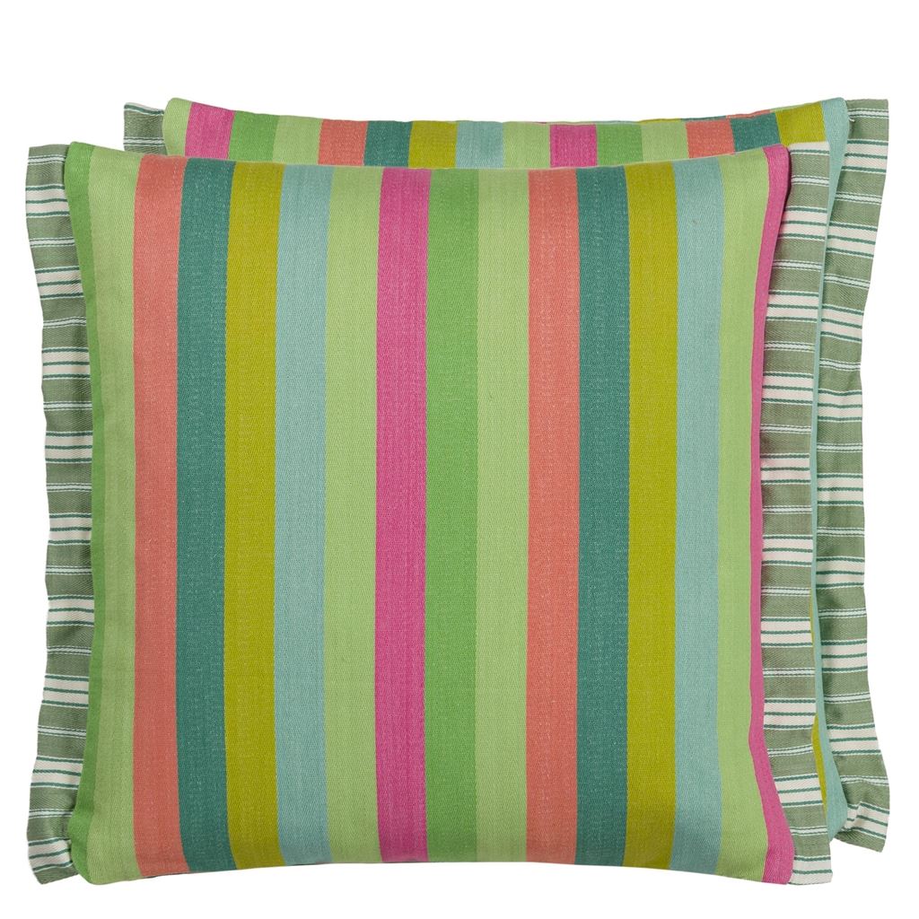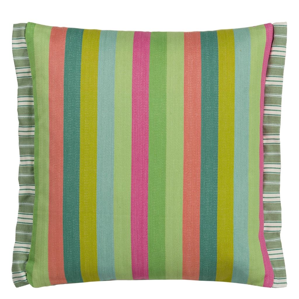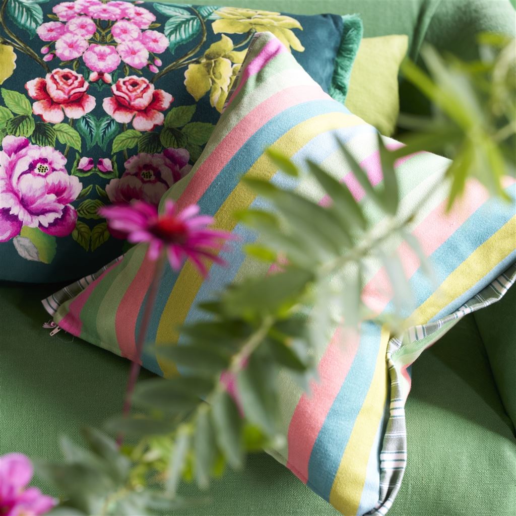 This charming multi coloured cotton woven stripe cushion in vibrant shades of fuchsia and emerald green is paired with a smart mid scale tonal stripe and finished with a contemporary pin striped trim on two sides. The perfect striped cushion for your interior scheme.
