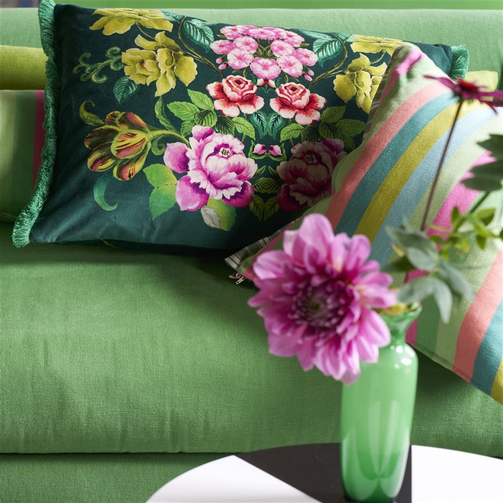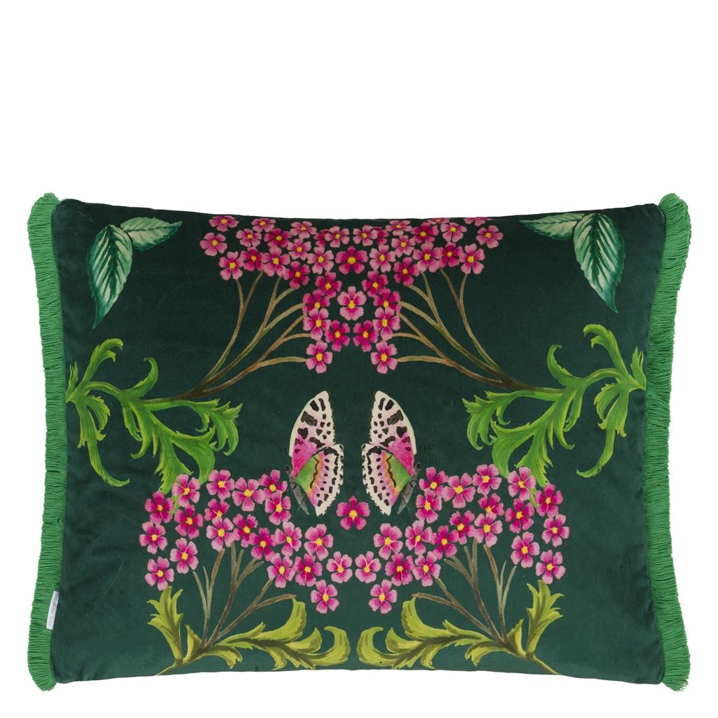 Elegant painterly studies of trailing spring flowers and foliage are set in a mirrored damask form in this stunning large rectangular floral cushion in rich viridian green. Digitally printed onto luxurious velvet and finished with a brush fringed trim on two sides.