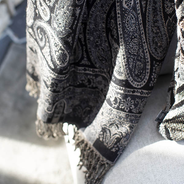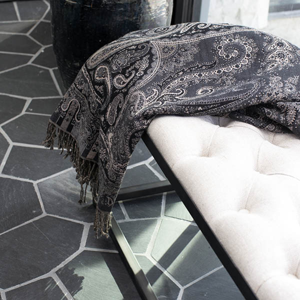 En elegant vävd pläd med ett vackert paisleymönster. Pläden har tvinnade fransar längs kortsidorna, vilket ger en stilfull touch. Perfekt för att skapa en varm och inbjudande atmosfär i ditt hem. Material: 100% bomull