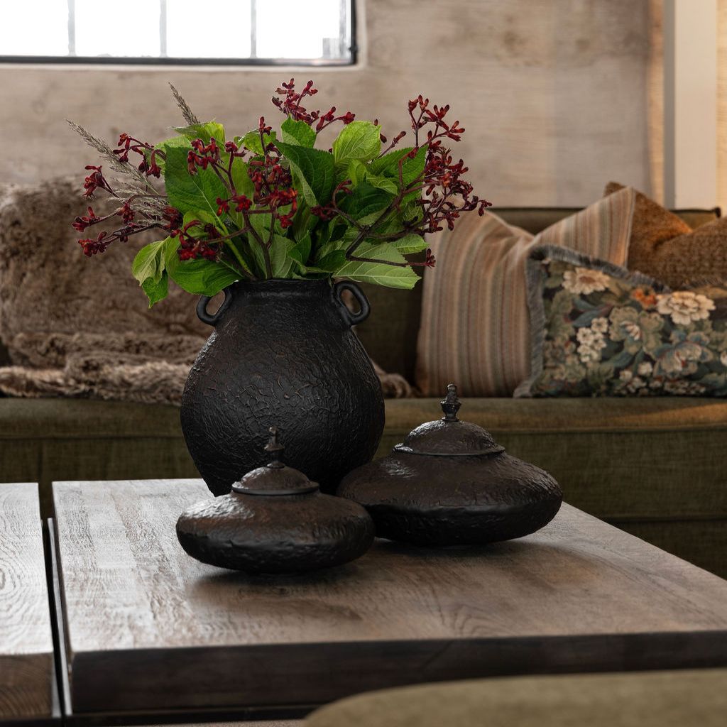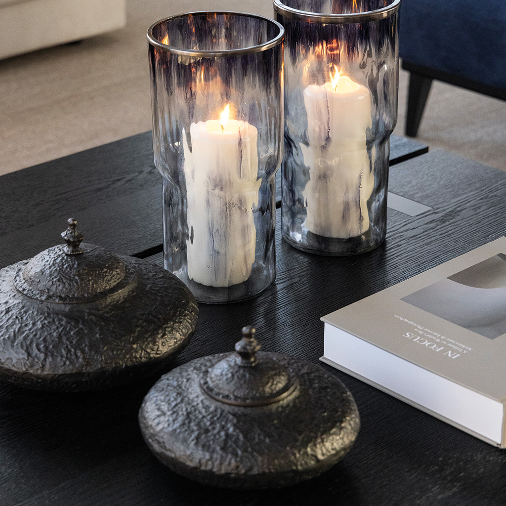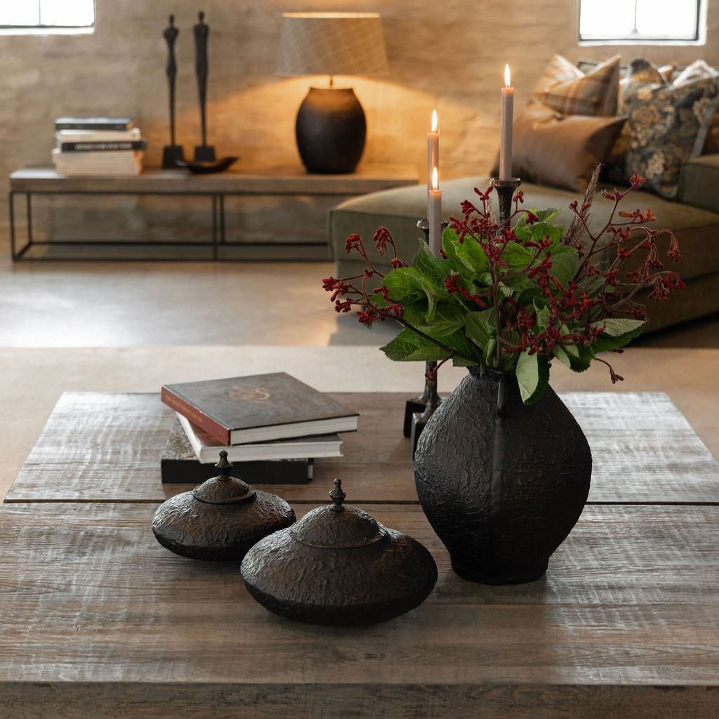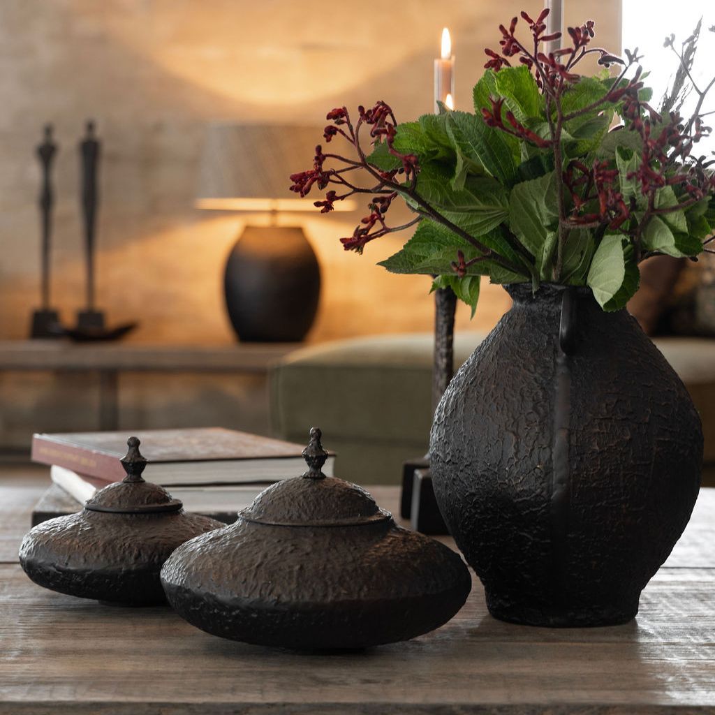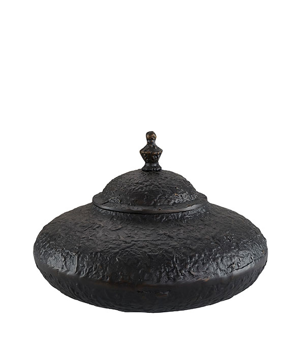Rund dekorationsask med lock i metall. Strukturerad yta.
