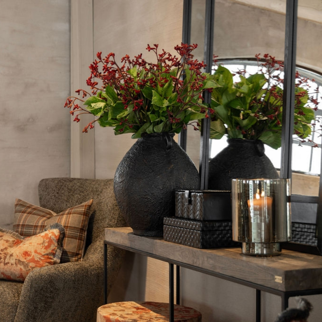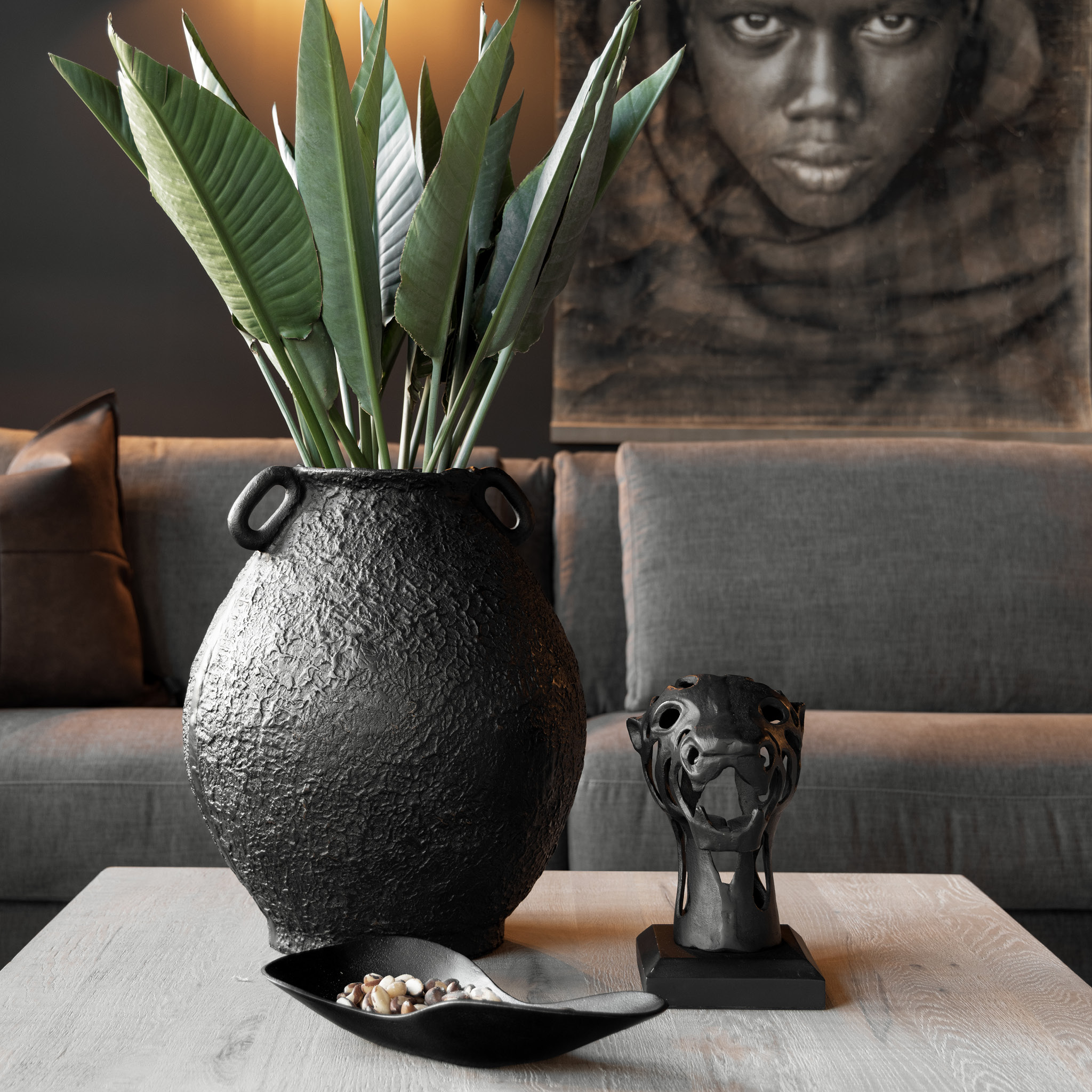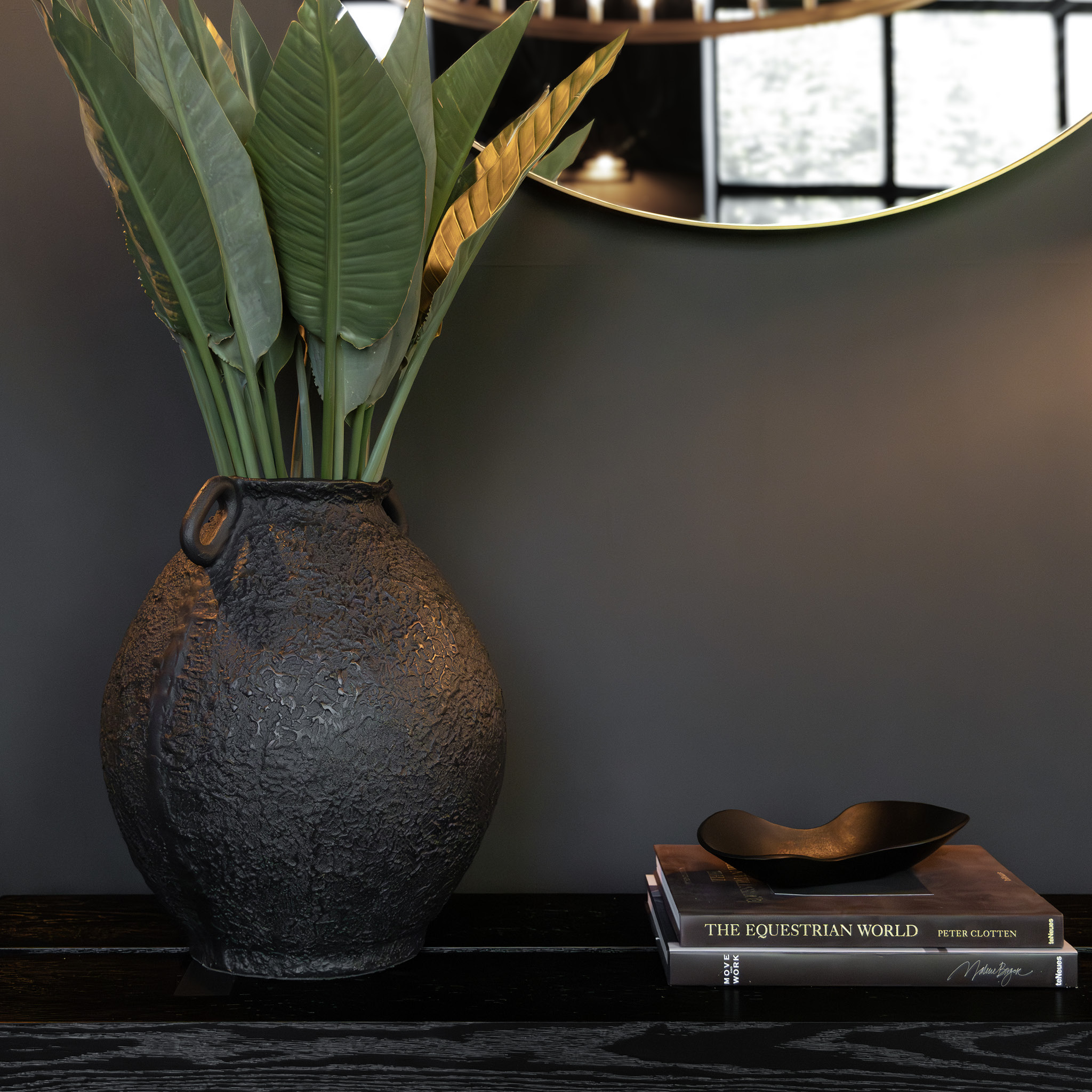 En stor urna av metall med yta i struktur. Urnan är vackert formad och har handtag. Denna urna/vas är inte vattentät och ska endast användas utan vatten.