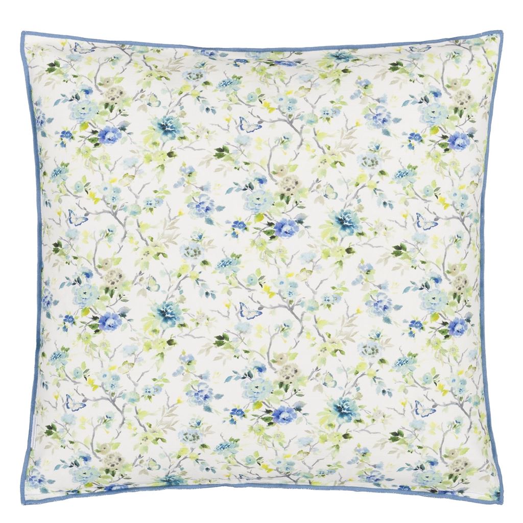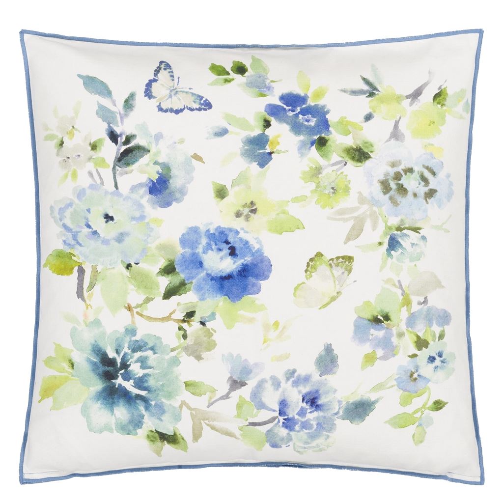 A large square floral cushion featuring water coloured branches of blossom, blooms and foliage with the occasional butterfly. In soft delft blue tones, this beautiful cushion is digitally printed onto a soft textural cotton and finished with an overlocked edge detail on all four sides.