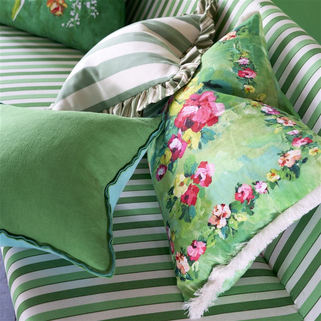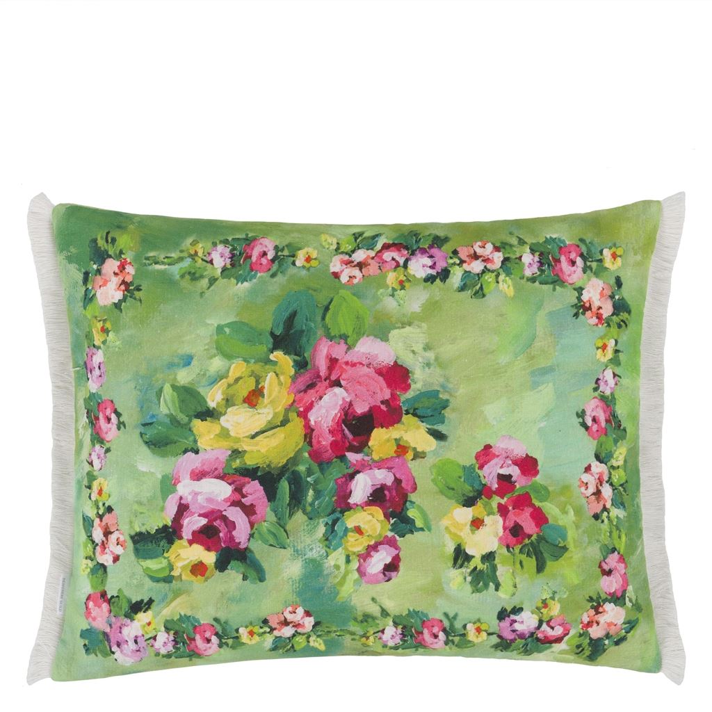Striking garlands and bouquets of brightly coloured blooms adorn a rich textured emerald green ground in this statement rectangular cushion. This stunning painterly floral cushion is digitally printed onto pure tumbled linen and finished with a contemporary chalk fringed trim on two sides.