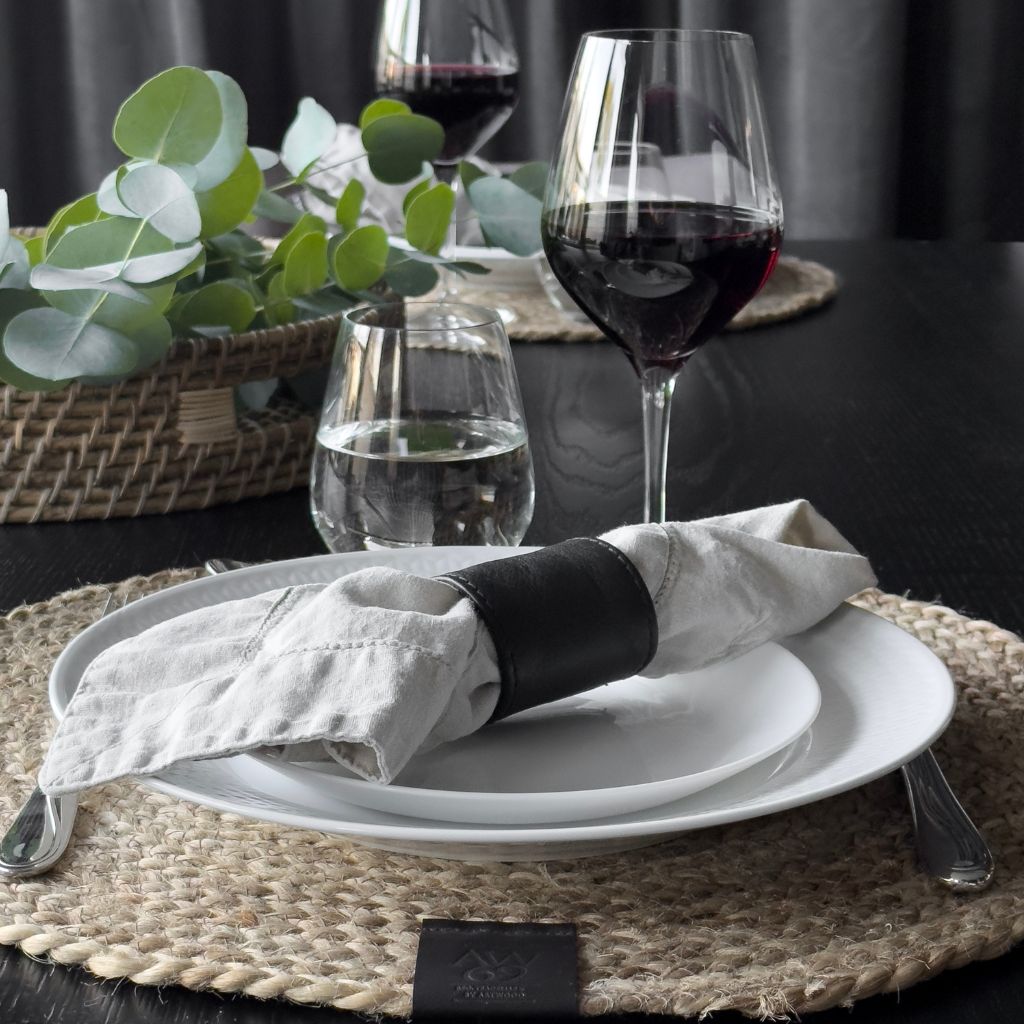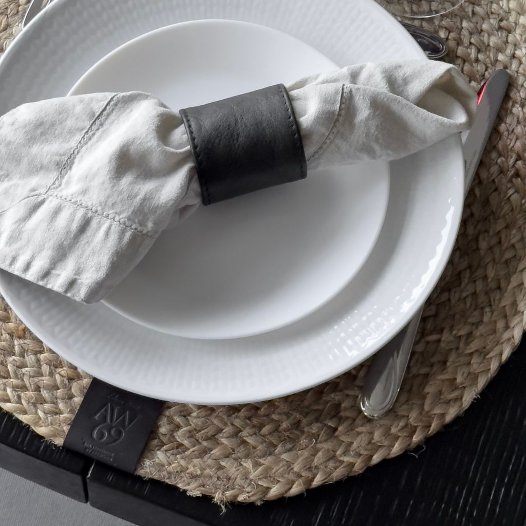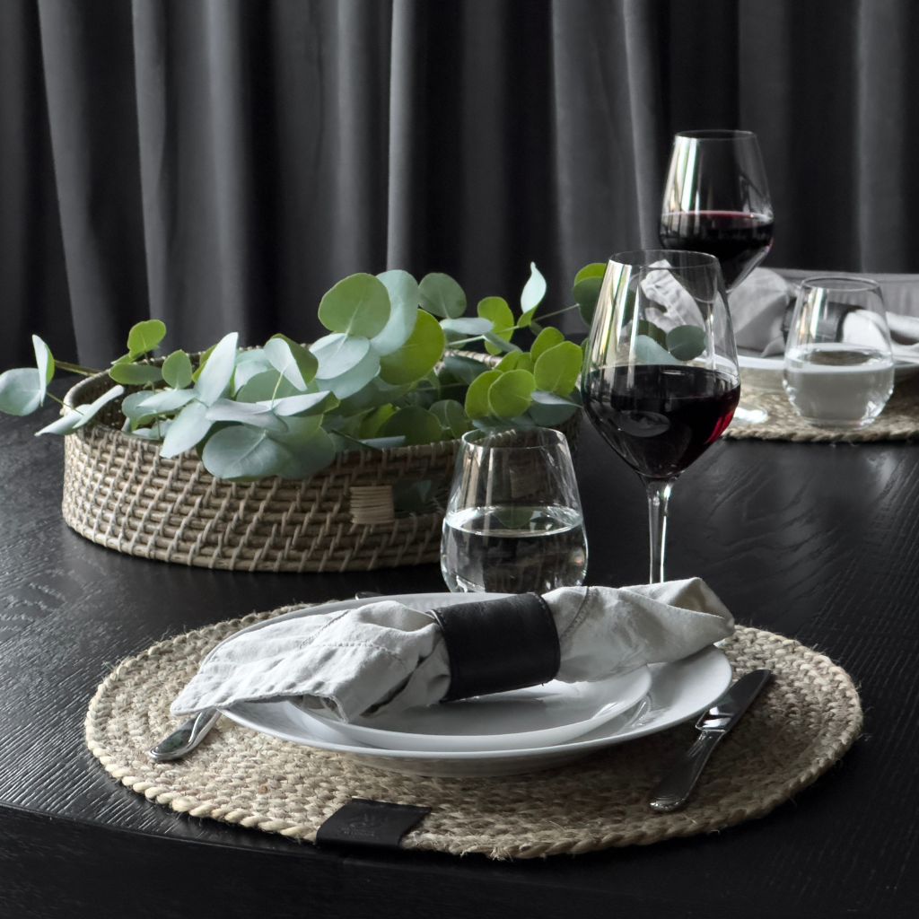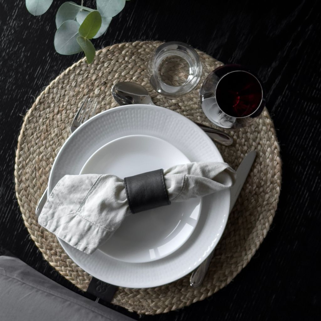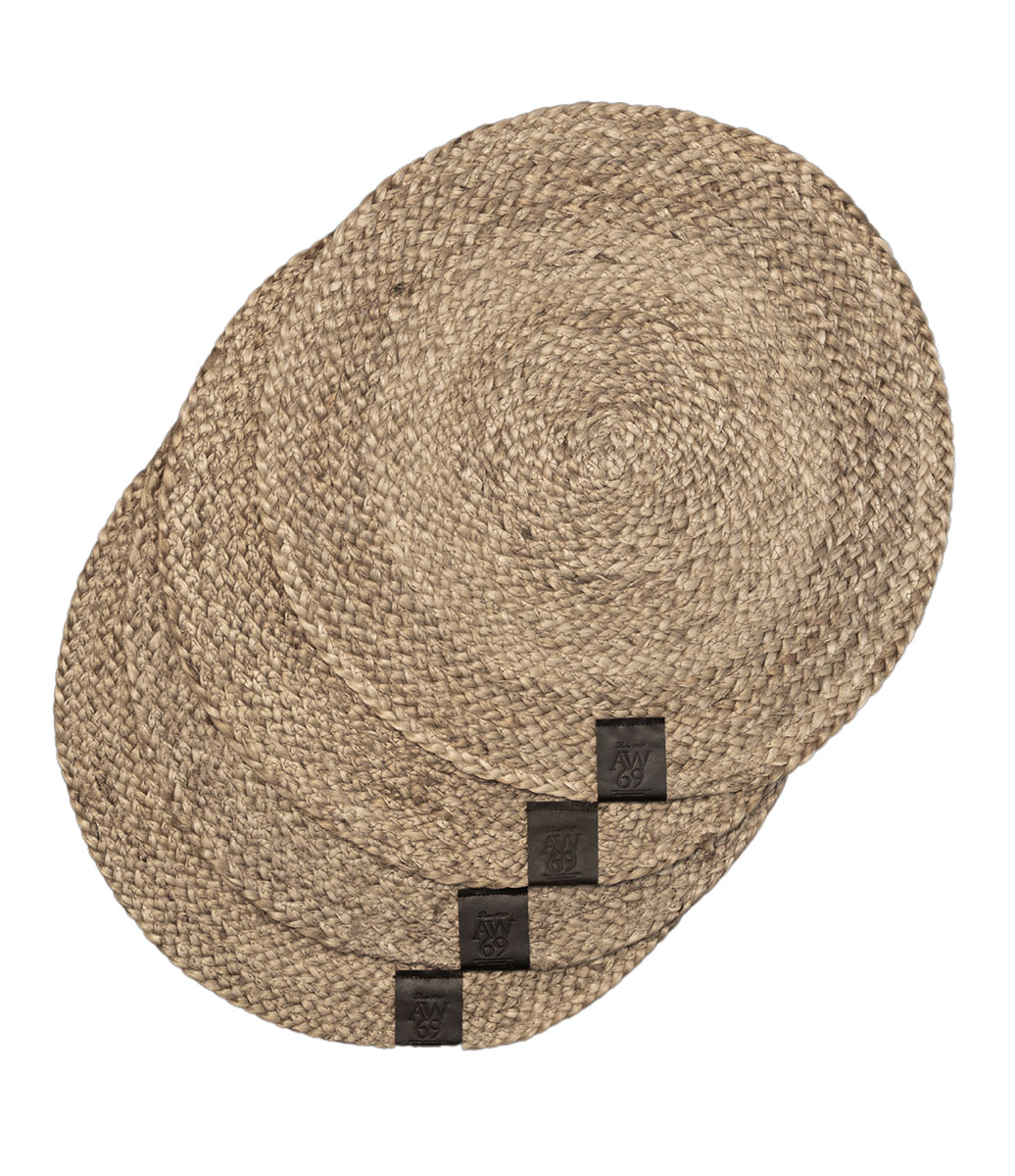Set med fyra bordstabletter i vävd jute. Diameter: 40 cm.