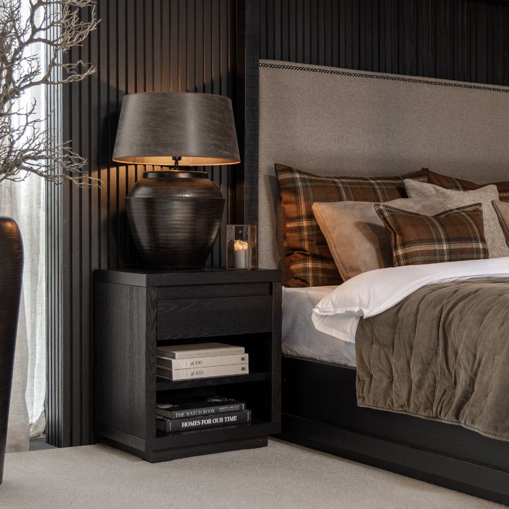 Sängbordet Hunter består av ekfanér i färgen Black. Hunter serien ger ett både modernt och robust intryck med sin minimalistiska design och tydliga trästruktur. Sängbordet har en utdragbar låda, och ett hyllplan som går att ta ur vid behov. Ekfanéren målas och lackeras i flera steg, vilket ger en hård och tålig yta, men behåller sin naturliga ådring och utseende. Fanér består av en tunn skiva trä, som limmas på en stum och hård fiberskiva i MDF. I vår populära Hunter serie hittar du både matbord, sängbord, byråer och andra möbler.