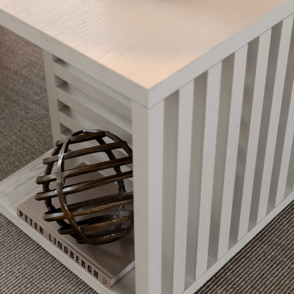 Elegant sidobord i ekfanér med distinkta, vertikala ribbor som skapar en modern och sofistikerad design. Bordsskivan har en vacker trästruktur som framhäver ekens naturliga toner och ger en varm, tidlös känsla. De stående ribborna längs sidorna tillför textur och karaktär, vilket gör bordet till ett iögonfallande inslag i både moderna och klassiska inredningar.