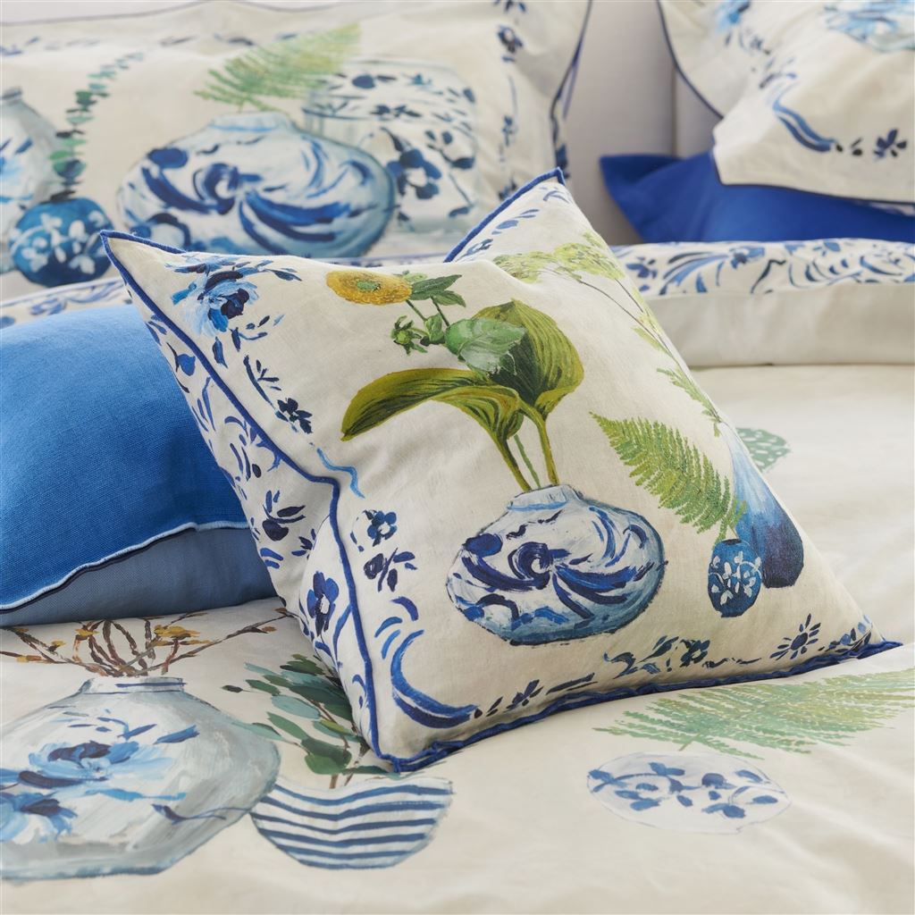 Still life studies of an eclectic mix of vases filled with ferns, blooms and foliage strike an elegant, contemporary note in this illustrative floral cushion. Digitally printed onto softly tumbled pure linen, this luxurious cushion in cobalt blue tones is overlocked on all four sides and paired with an all over pattern on the reverse.
