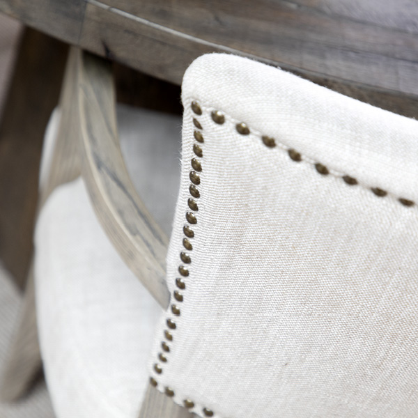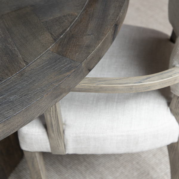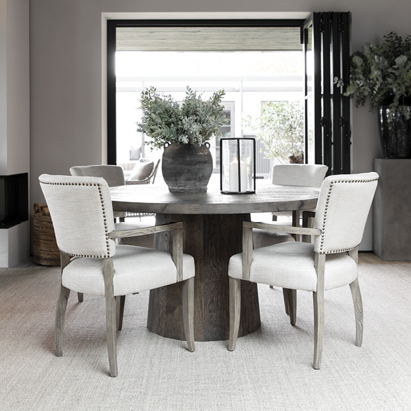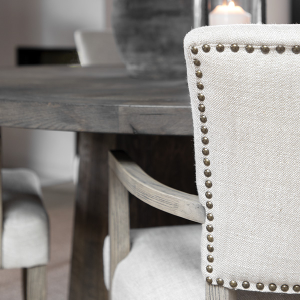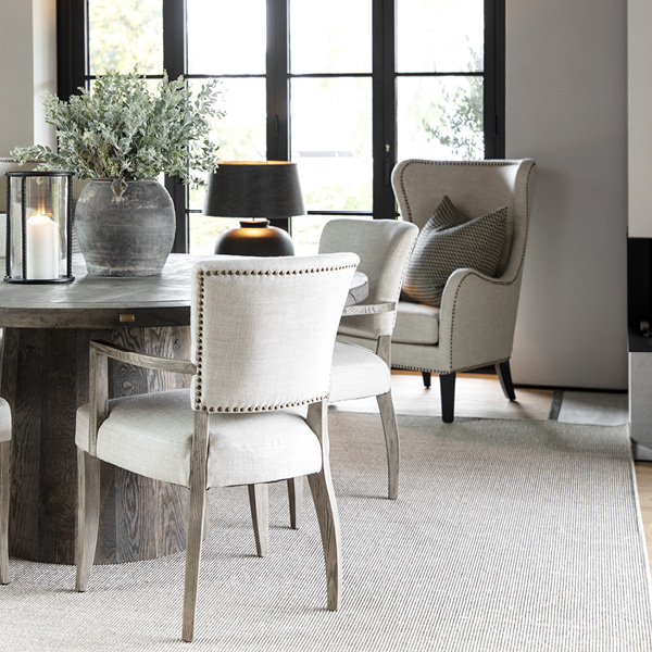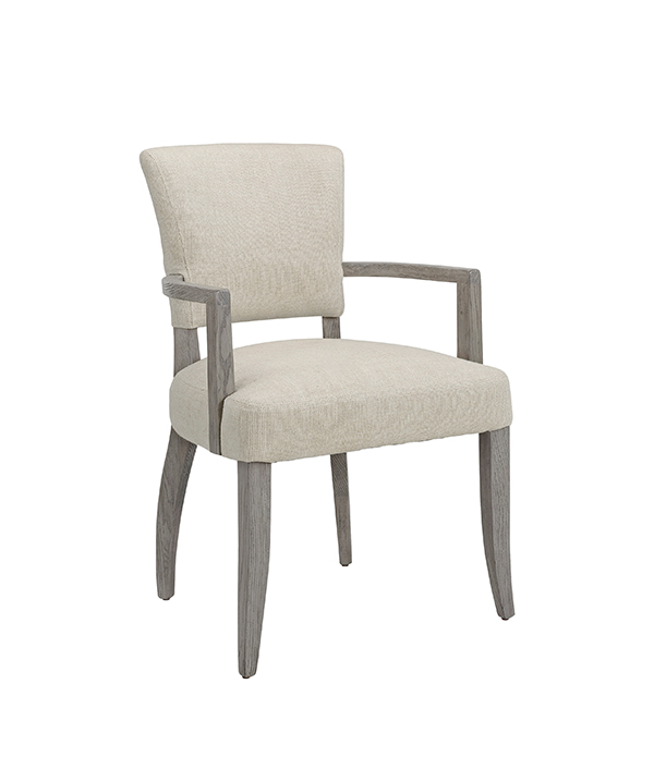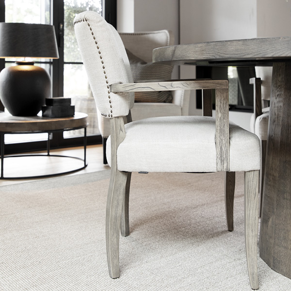 Maggie karmstol i högkvalitativt vävt tyg kombinerar enastående komfort med tidlös design. De robusta träbenen ger stabilitet och hållbarhet, medan de dekorativa nitarna på ryggstödet tillför en sofistikerad detalj som lyfter stolens eleganta utseende. De bekväma armstöden gör stolen perfekt för långa middagar eller avslappnade stunder runt matbordet. Tack vare sitt klassiska och moderna uttryck passar den sömlöst in i både samtida och traditionella miljöer. Det texturerade vävda tyget ger en raffinerad känsla och är lätt att underhålla, vilket gör stolen till ett praktiskt och stilfullt val för ditt hem.