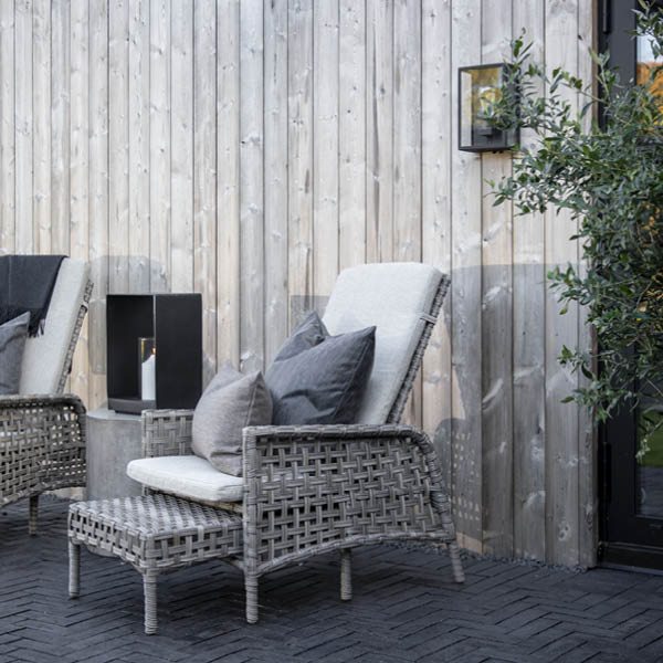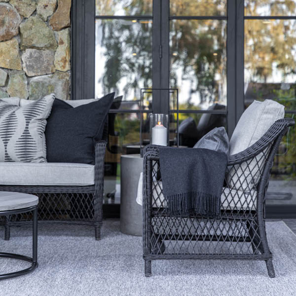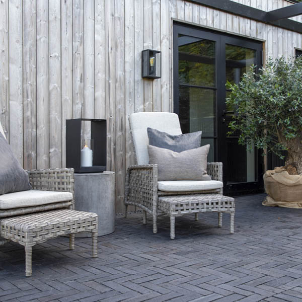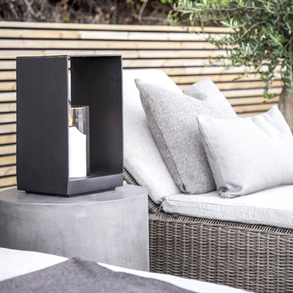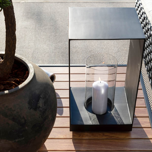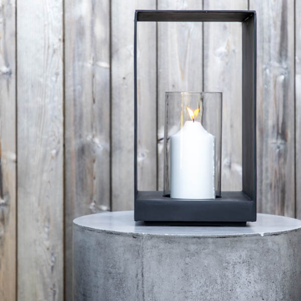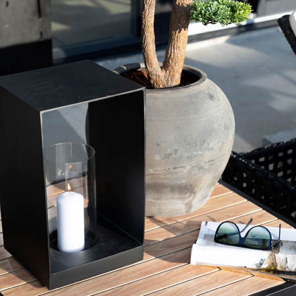 Stilren lykta i svart aluminium med raka former och handblåst glas som skapar ett stämningsfullt sken. Den moderna designen blir en tidlös inredningsdetalj året om.
