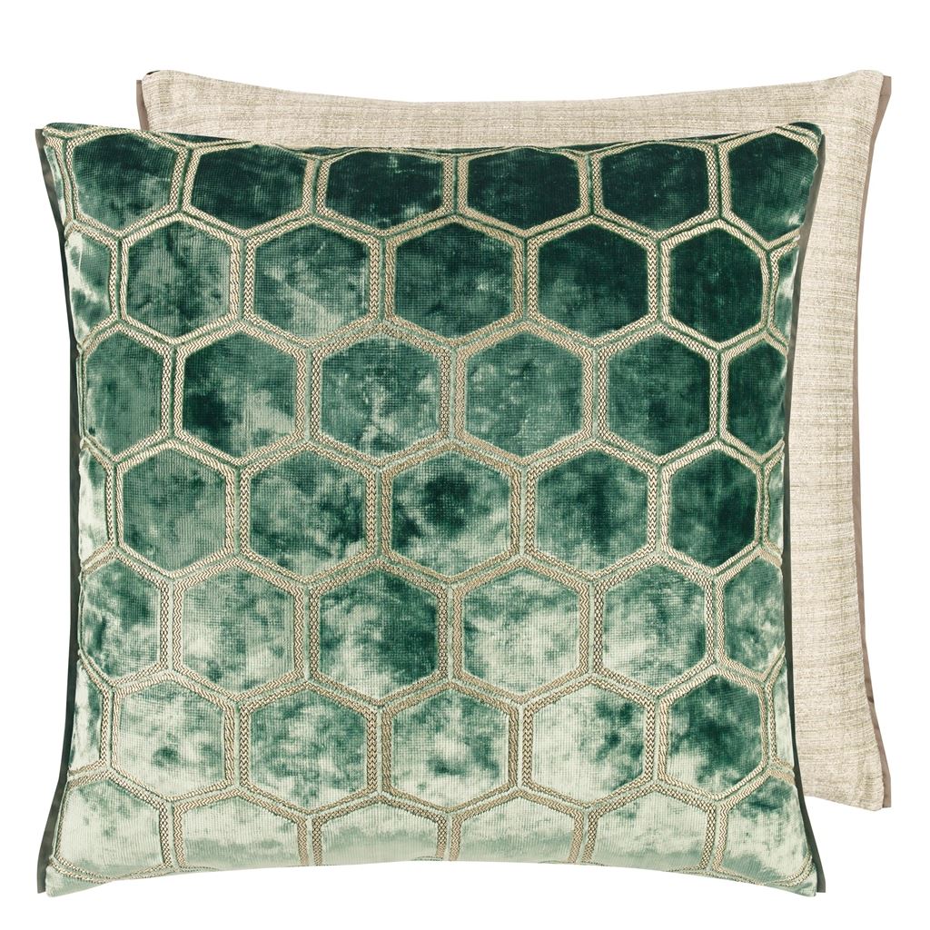 This stylish cut velvet large square cushion in jade features a bold scale hexagonal geometric pattern. Finished with a Kumana reverse in cool marble and a zinc trim.