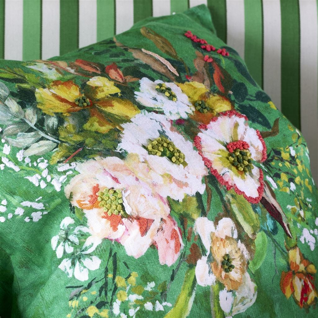 Elegant painterly studies of trailing spring flowers are digitally printed onto pure linen and embellished with equisite embroidered details. Reversing to a digitally printed floral on linen. This large square decorative floral cushion in emerald green tones will make a stunning statement in your interior scheme.