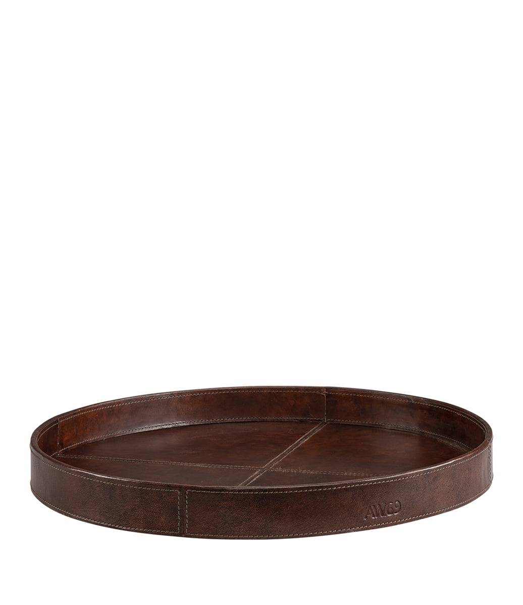 En rund bricka klädd i högkvalitativt läder med dekorativa sömmar. Med en diameter på 41 cm är den perfekt för både servering och som en elegant inredningsdetalj. Brickans robusta konstruktion och tidlösa design gör den till ett idealiskt val för både moderna och klassiska hem.