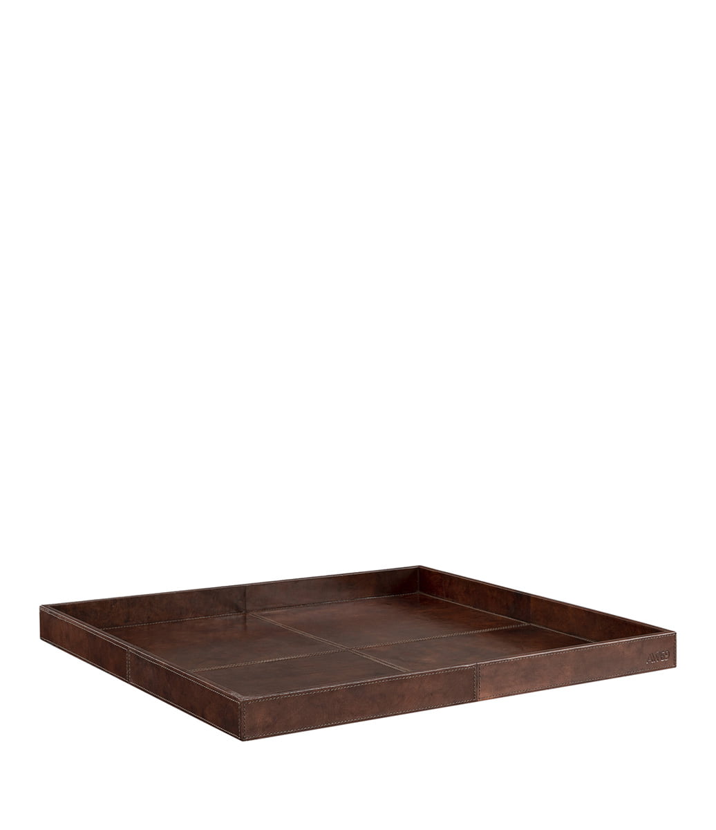 En fyrkantig bricka klädd i läder med dekorativa sömmar. Perfekt för servering eller som ett dekorativt inslag. Brickans robusta konstruktion och tidlösa design gör den till ett idealiskt val för både moderna och klassiska hem.