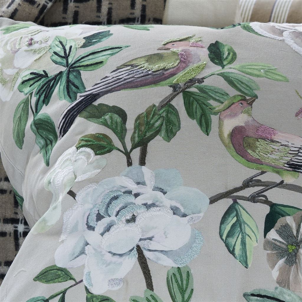 This large square decorative floral cushion features elegant painterly studies of flowers and birds digitally printed onto a cotton canvas and embellished with exquisite embroidered details. Reversing to a digitally printed butterfly floral scene this stylish floral cushion in shades of delicate cameo pink will make a stunning statement in your interior scheme.