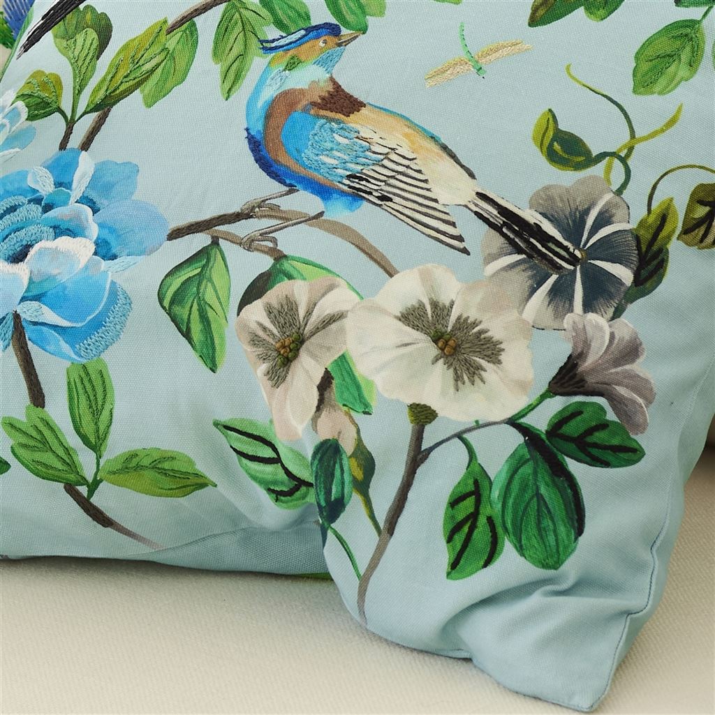 This large square decorative floral cushion features elegant painterly studies of flowers and birds digitally printed onto a cotton canvas and embellished with exquisite embroidered details. Reversing to a digitally printed butterfly floral scene this stylish floral cushion in shades of cobalt blue will make a stunning statement in your interior scheme.