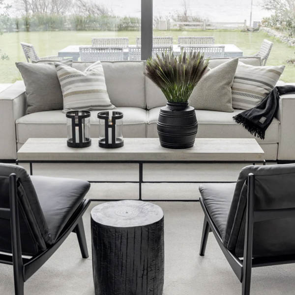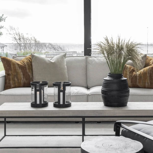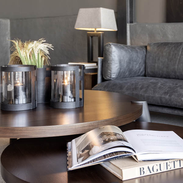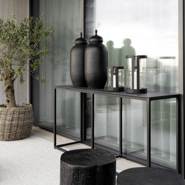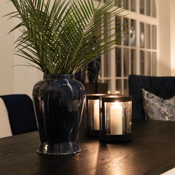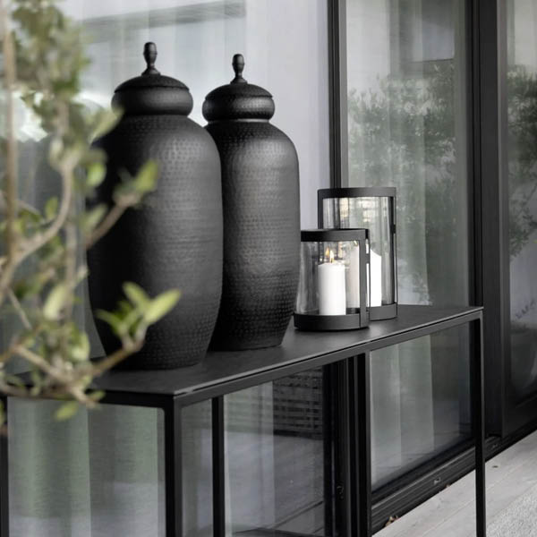 Svart lykta i pulverlackerad metall med läderdetaljer. Handblåst glas.