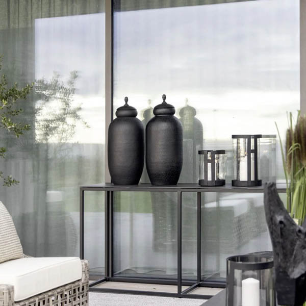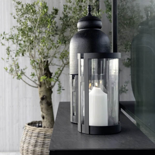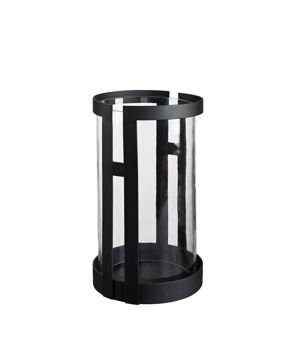 Svart utomhuslykta i pulverlackerad metall och handblåst glas. Diameter: 20