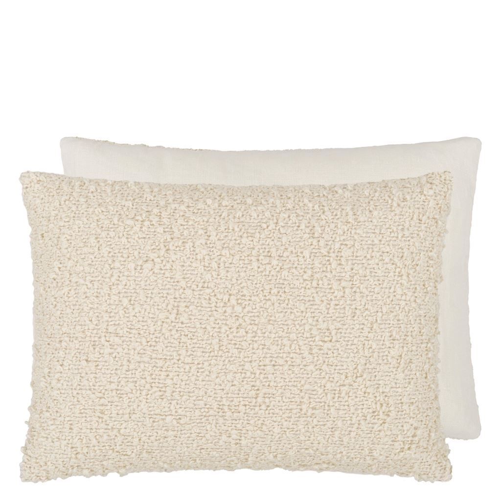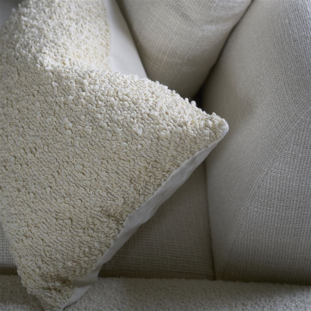Woven with natural undyed wool, this contemporary rectangular cushion combines varying scales of looped and boucle effect yarns for incredible depth and texture. Swaledale chalk is paired with our beloved pure tumbled linen Brera Lino in chalk white.